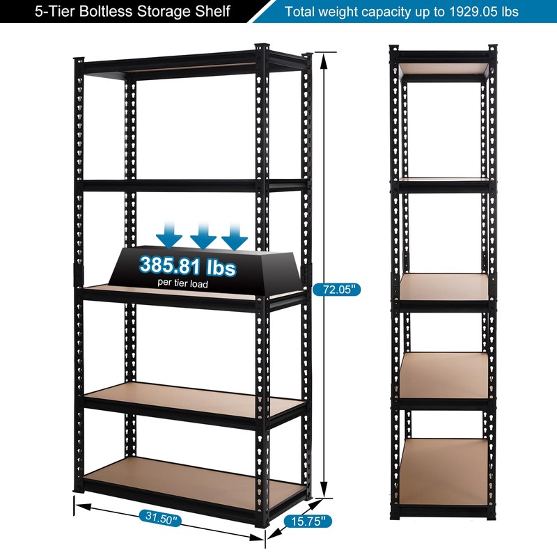 - HEAVY DUTY STORAGE SHELVES: Each shelf can hold up to 385.81lbs, with a total bearing capacity of 1929.05lbs, the heavy duty shelving units are robust and versatile so they are able to be used effectively in a large variety of environments, from offices and utility rooms to garages and workshops. Measures 31.5"Wx15.75"Dx72"H.