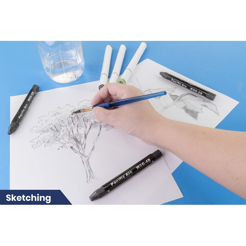 Water Soluble Graphite Sticks are made from high quality graphite with the superb feature of water solubility. The thick, heavy body enables easy handling and a solid weighty feel. Use dry gaphite stick onto wet or dry paper, wet graphite onto wet or dry paper, or dry graphite sketch washed over with wet brush.Graphite Sticks measure 7/16 in. x 4 3/4 in. Soft Set contains: 8B, 10B, 12B Medium Set contains: 2B, 4B, 6B