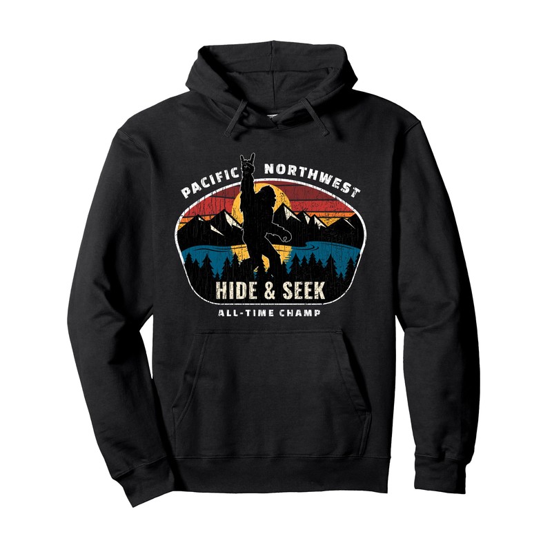 - Pacific Northwest Bigfoot Hide and Seek Champ Sasquatch Gift features Bigfoot holding up the rock on hand rock and roll with retro sunset mountain range and lake. The design is distressed to give it a vintage worn style.