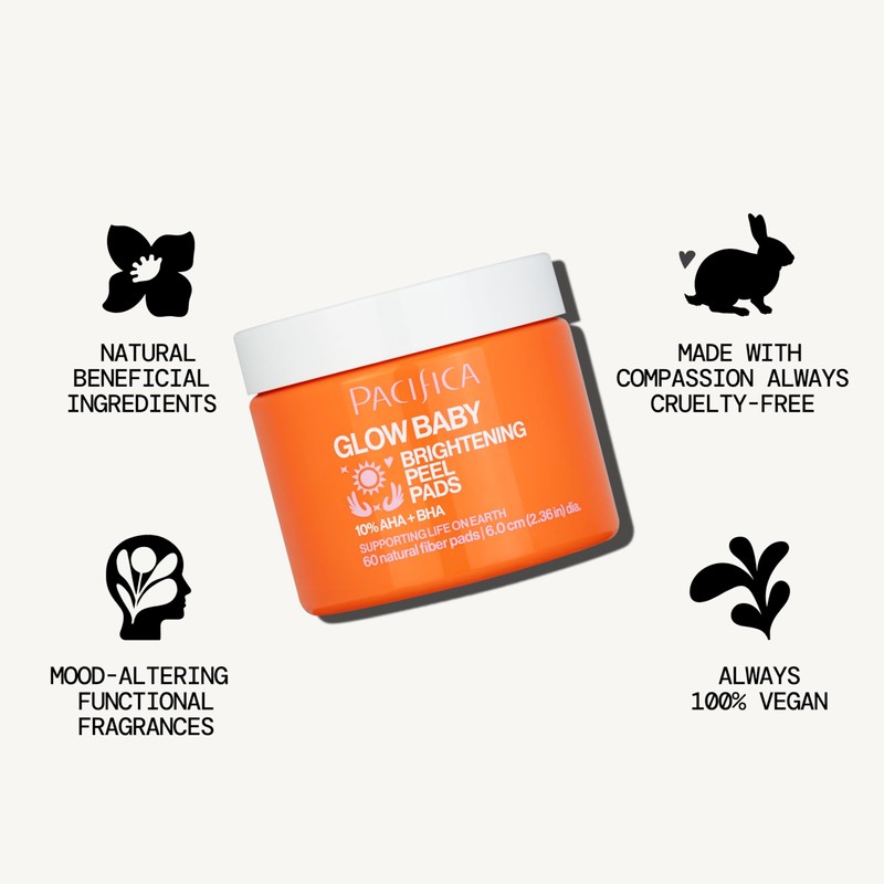Pacifica Glow Baby Brightening Peel Pads 10% AHA + BHA Exfoliating Face Pads for Glowing Skin Resurfacing Glycolic Acid & Salicylic Acid Pad to Smooth Texture & Minimize Pores Fragrance Free 60 Count