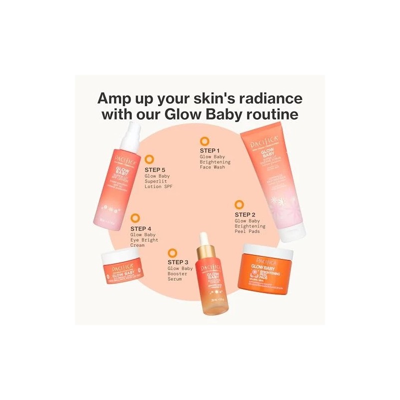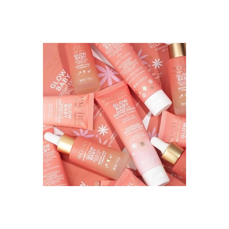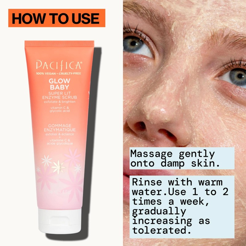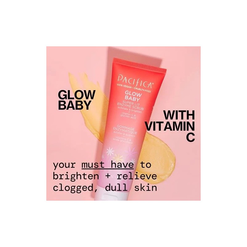 Get Your Glow On with Dual Exfoliation: Meet your new secret to radiant skin – the Pacifica Glow Baby Super Lit Enzyme Scrub. This unique exfoliating face wash uses a dual-action approach to banish dullness: ultra-fine rice powder provides a gentle physical scrub, while natural fruit enzymes (from pineapple and papaya) act as a **chemical exfoliant** to dissolve dead cells and unclog pores. The result Instantly smoother, softer skin that’s ready to glow.Vitamin C & Glycolic Acid Brightening Blend: Formulated with our Glow Baby complex of stabilized vitamin C and glycolic acid (AHA), this scrub helps brighten and even out your skin tone over time. Regular use can fade the appearance of dark spots and discoloration, revealing a fresher, more luminous complexion. The 2% glycolic acid works alongside the fruit enzymes to resurface uneven texture and minimize fine bumps, all without overly irritating the skin.Clarifying, Acne-Friendly Formula: Don’t let the glow fool you – this exfoliator also means business for congested skin. By clearing away pore-clogging debris and excess oil, it helps fight blackheads and prevent breakouts. The formula is **microbead-free** and uses biodegradable exfoliants, so it’s good for your skin and the environment. With soothing plant extracts and antioxidant support, even acne-prone or combination skin can enjoy the benefits of this scrub without redness or over-drying.Clean Beauty & Cruelty-Free: Like all Pacifica products, the Glow Baby Enzyme Face Scrub is **100% vegan and cruelty-free**. We’ve left out harsh chemicals and unnecessary fillers: no parabens, phthalates, sulfates, or mineral oil here. Instead, you get naturally effective ingredients that polish your skin to perfection. Treat your face to a spa-like brightening experience and reveal your most radiant, baby-soft skin – all while staying true to clean, ethical skincare practices.