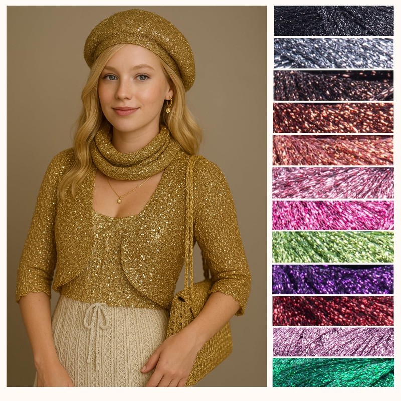- Metallic Glitter Yarn with Sparkle & Twinkle Effect This fine, shiny, lurex tinsel yarn adds a glittery and sparkly touch to your projects. The metallic fiber creates a twinkle effect, perfect for crocheting, knitting, and crafting unique designs with sequins & thick threads.