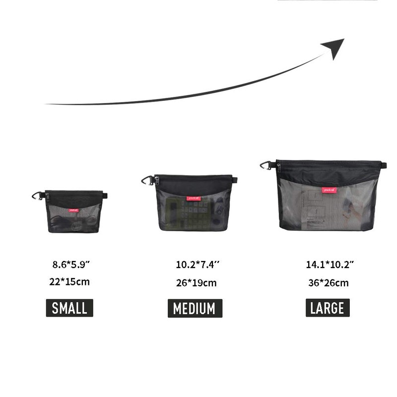- DIFFERENT SIZES TO CHOOSE - 3 sizes to suit all your storage. Large size for iPad Pro, paper documents, magazines, clothes, etc. Medium Size for notebook, passport, driving license, etc. It also stores Lady's cosmetics. Small size for mobile phone, cables, car key, ID card, stationery, etc. It can store first-aid medicine as first aid kit outdoors.