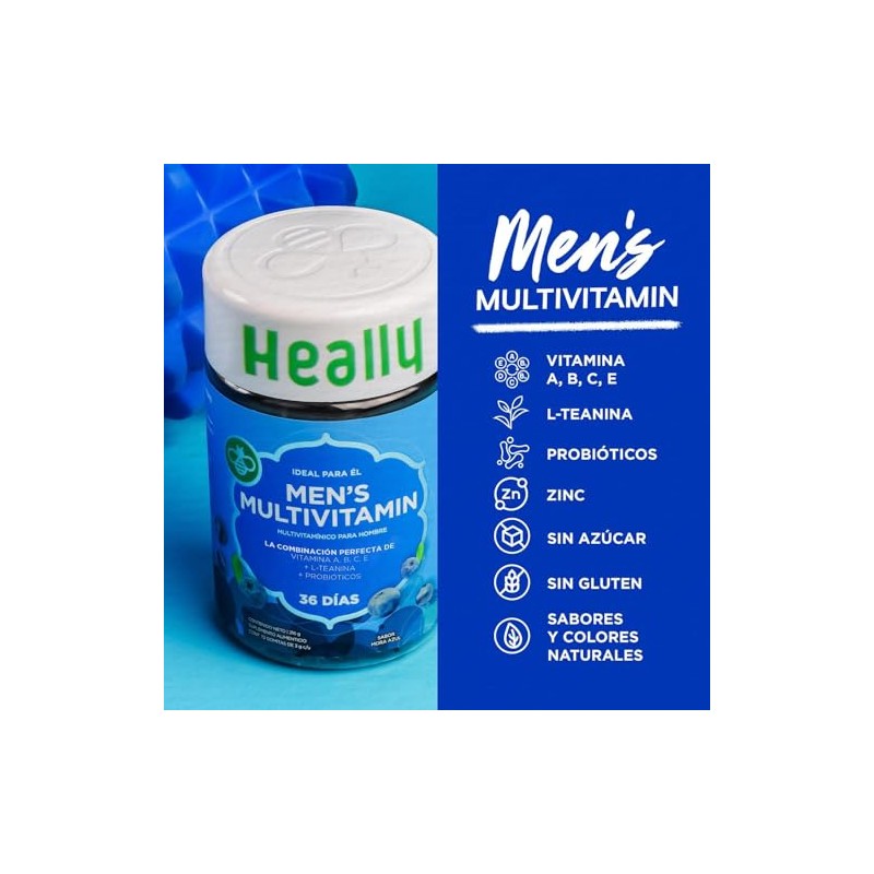 Pack Heally Hombre y Mujer: Multivitamínico Energía con Ácido Hialurónico y Omega-3, Sabor Fresa y Granada, 100% Natural, Sin Azúcar ni Gluten y Multivitamínico con Omega-3, L-Teanina y Probióticos, Sabor Mora Azul, 72 Gomitas, 36 Días, 100% Natural, Sin Azúcar ni Gluten