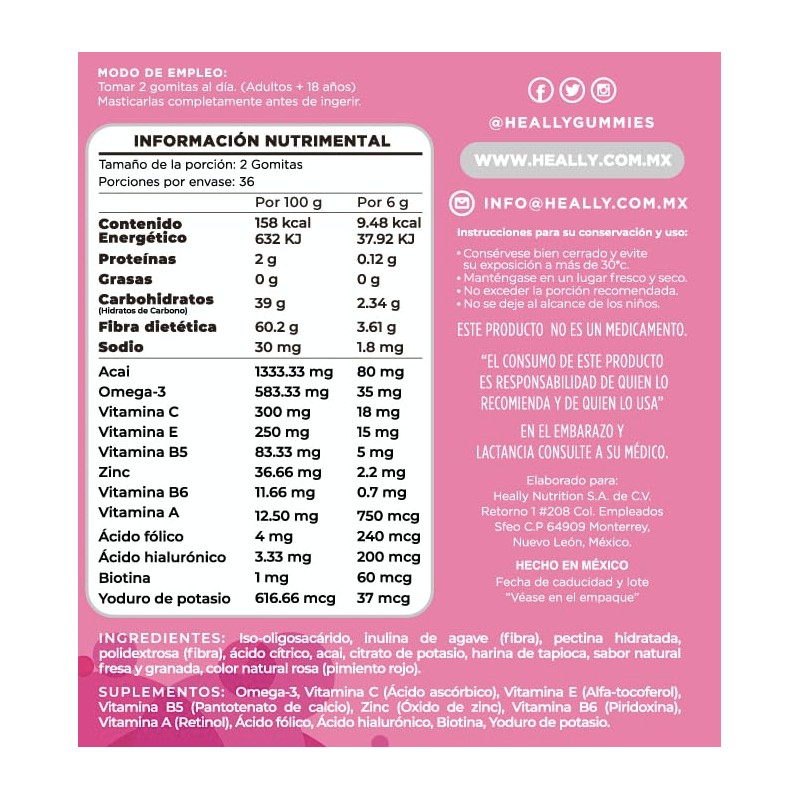 - En Heally creemos que cada uno de nosotros tiene la capacidad de sanarse a sí mismo y que la naturaleza nos brinda elementos que podemos usar a nuestro favor. Es por eso que creamos productos que aprovechan estos elementos para ayudarte a tener una vida más saludable. Creemos que los pequeños cambios a la larga hacen una gran diferencia en nuestra vida, y que tienen la capacidad de transformarla completamente, es por eso que elegimos una abeja como nuestro símbolo ya que simboliza transformación, la abeja es una alquimista que convierte el polen en miel, al igual que Heally transforma y une los mejores elementos de la naturaleza para convertirlos en las mejores gomitas vitaminadas. Descripción del Producto: ✔ Presentación Comercial: Bote con 72 Gomitas de 3 gr para 36 días. ✔ Peso del Producto: 216 Gramos. ✔ Ingredientes Activos: L
