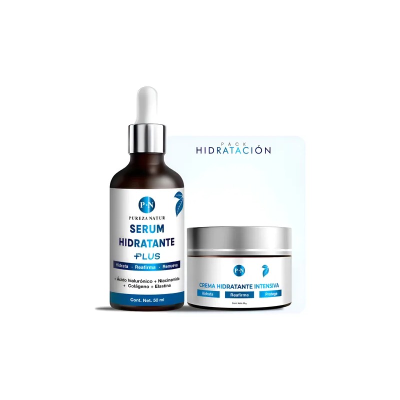 CONTENIDO: 1 Serum Hidratante Plus de 50ml y 1 crema Hidratante intensiva de 50gr, con activos concentrados como el ácido hialurónico, ácido glicólico de papaya, protector solar FPS 30, niacinamida, colágeno, elastina y aceite de rosa mosqueta. Todos actúan de forma intensiva para hidratar la piel, devolverle forma, tersura, y revertir signos de edad.
