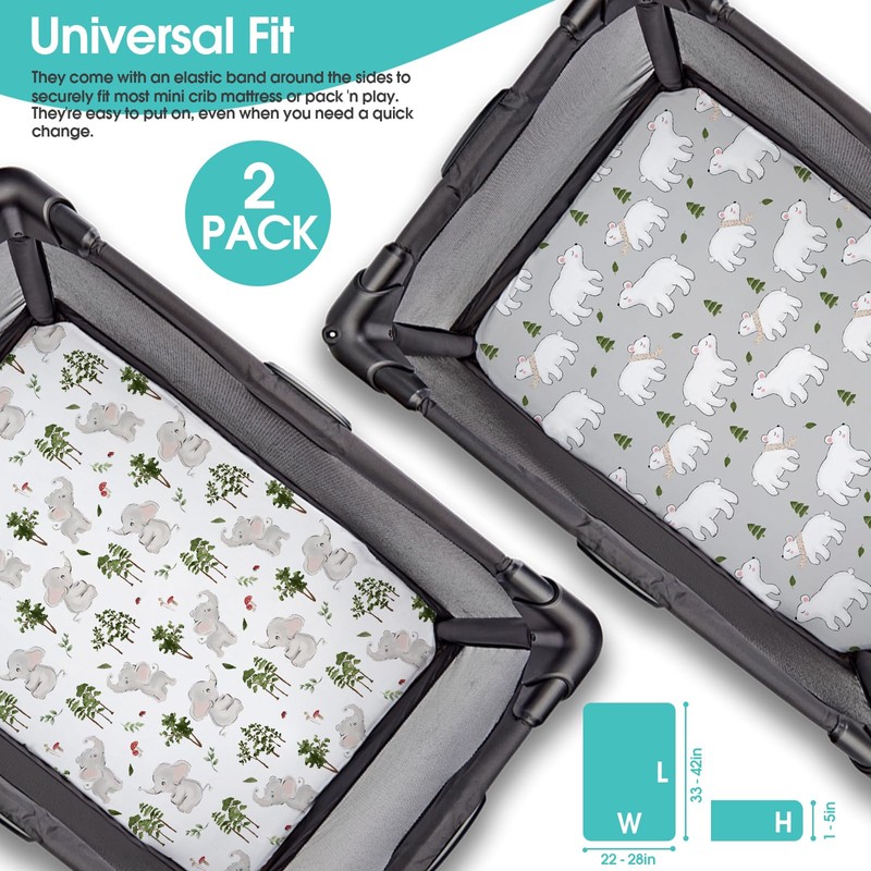 Pack n Play Sheets, BROLEX 2 Pack Mini Crib Sheets,Stretchy Portable Fitted Playard Sheet Set, Convertible Playard Mattress Cover,Ultra Soft Breathable Material,Elephants & Bears