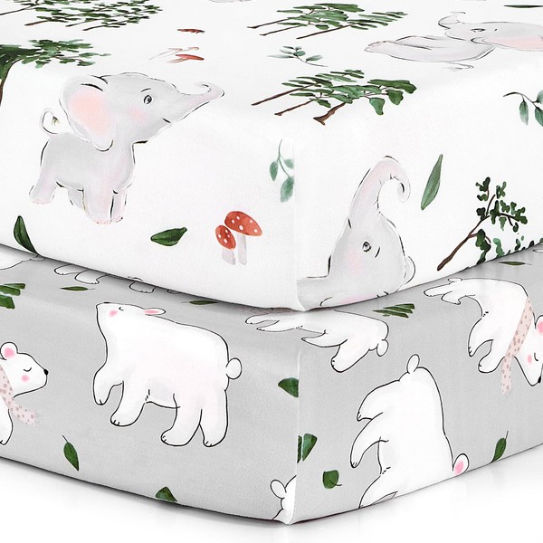 Pack n Play Sheets, BROLEX 2 Pack Mini Crib Sheets,Stretchy Portable Fitted Playard Sheet Set, Convertible Playard Mattress Cover,Ultra Soft Breathable Material,Elephants & Bears