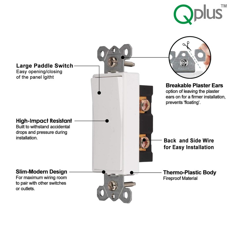 Pack of 1 - QPLUS Single Pole Decorative Switch, 15A / 120V, Tamper Resistant, Temperature Control and Fireproof Material