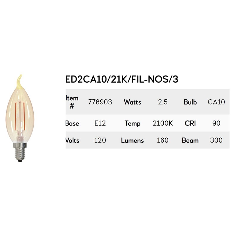 - CA10 bulb type, E12 candelabra base, 160 lumens, high 90 CRI, 2100k CCT