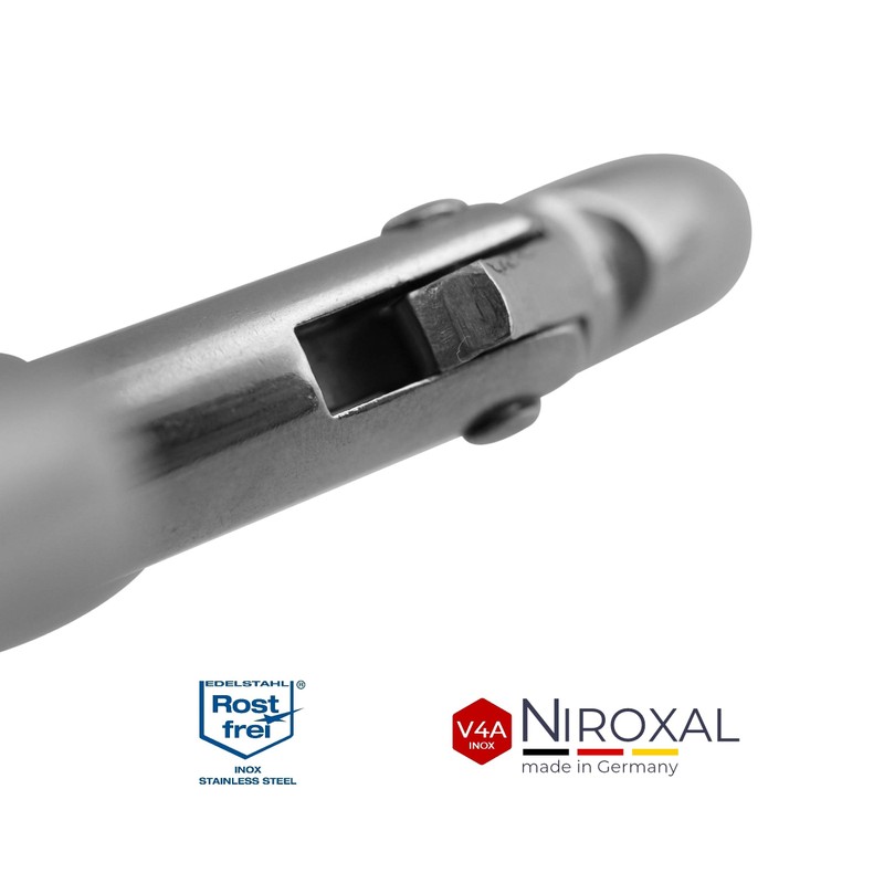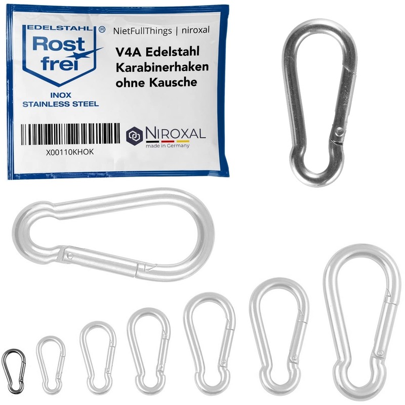 - Features: whether carabiner small or large carabiner, each individual is made of polished V4A stainless steel. This V4A stainless steel is manufactured in industrial quality (1,800 kg breaking load at 10 mm material thickness). In addition, they do not have a thimble (eye). Even cleaning is not a significant effort by simply rinsing. Corrosion infestation is not possible thanks to the stainless material, even in maritime environments, the function is always guaranteed.