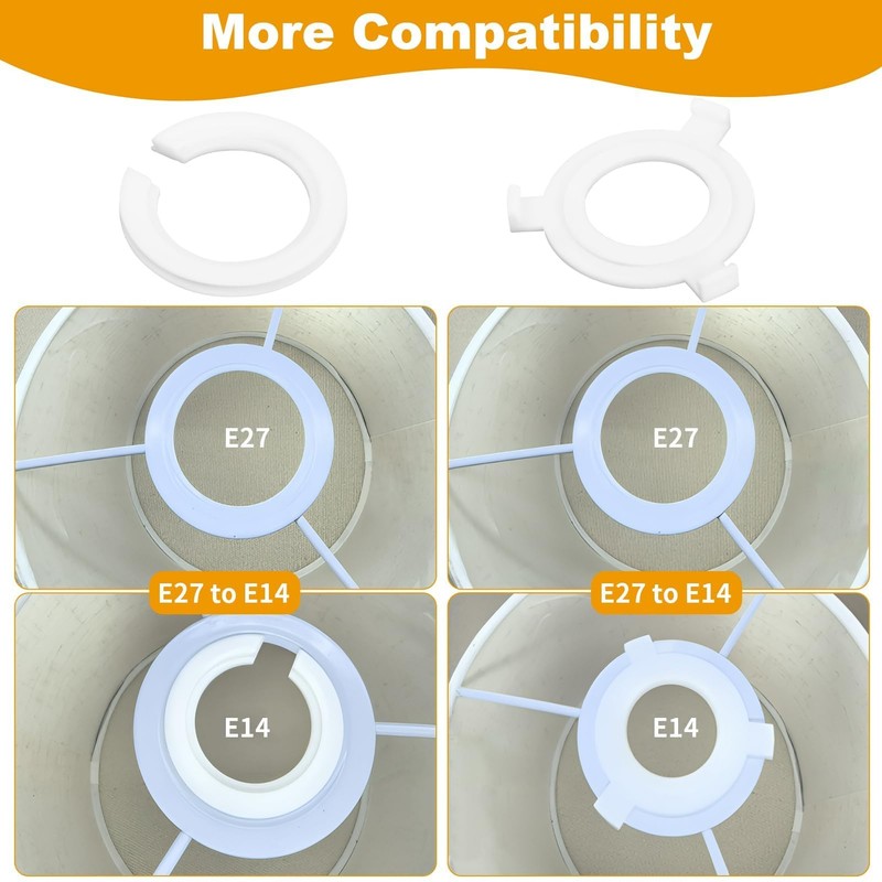 - Compatible with Standard Size The E27 to E14 adapter ring has an outer diameter of 48mm and inner diameter of 28mm; the E27 lampshade ring to E14 has an outer diameter of 44mm and inner diameter of 30mm. It is ideal for the fixed connection of lampshades with reducing rings or screw rings for stabilising lamp holders.