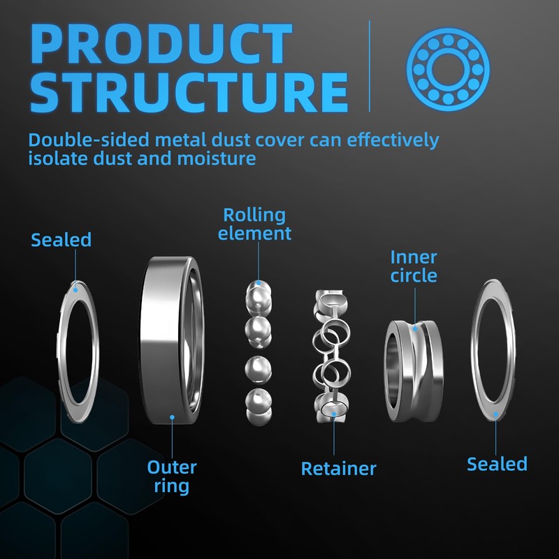 - SUPERIOR MATERIAL RUST PROOF AND CORROSION RESISTANT The main body of the miniature ball bearing is made of high carbon chrome bearing steel (GCr15), which has high hardness and strong fatigue resistance. The surface is specially treated to make it rust and corrosion resistant and ensure a longer service life. The double-sided metal dust cover can effectively isolate dust and moisture and adapt to complex environments.