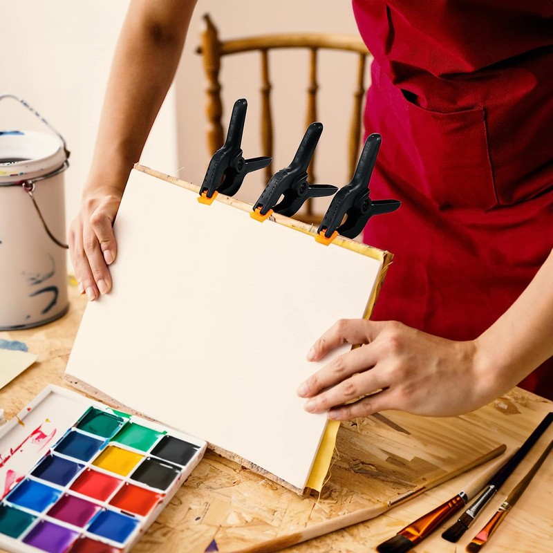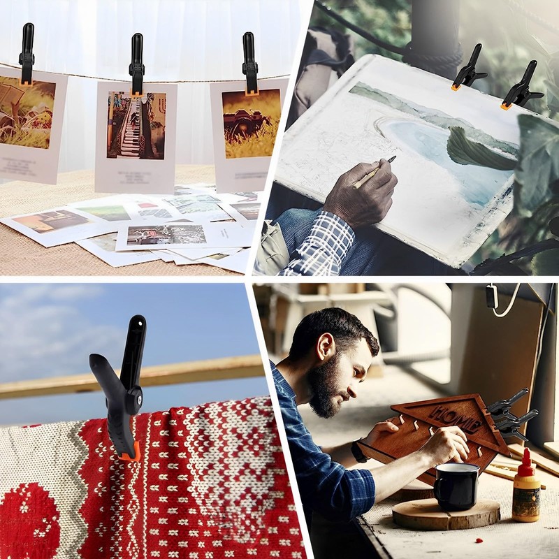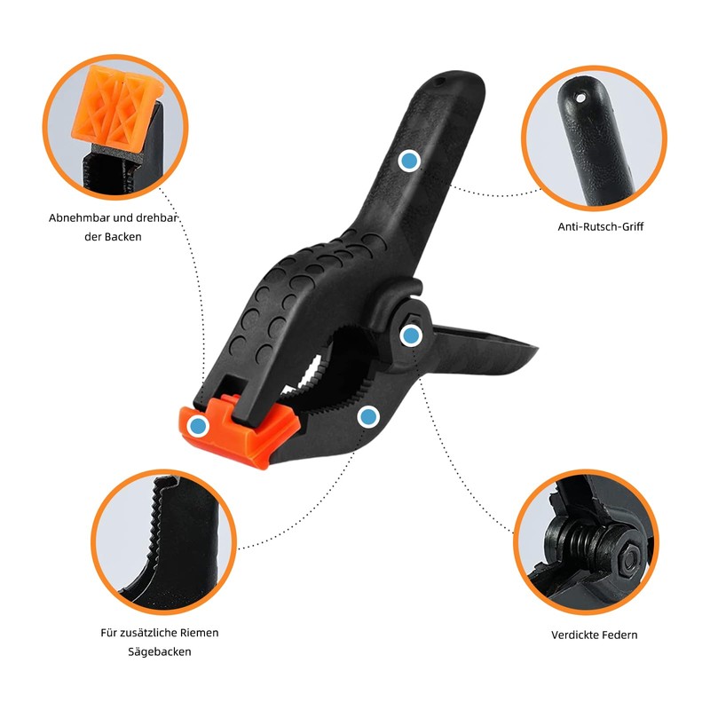- The orange jaws of the spring clamps are movable and can be rotated 90 degrees to adapt to different angles of objects.