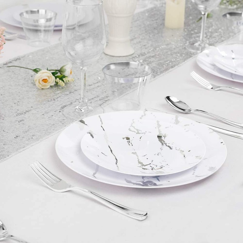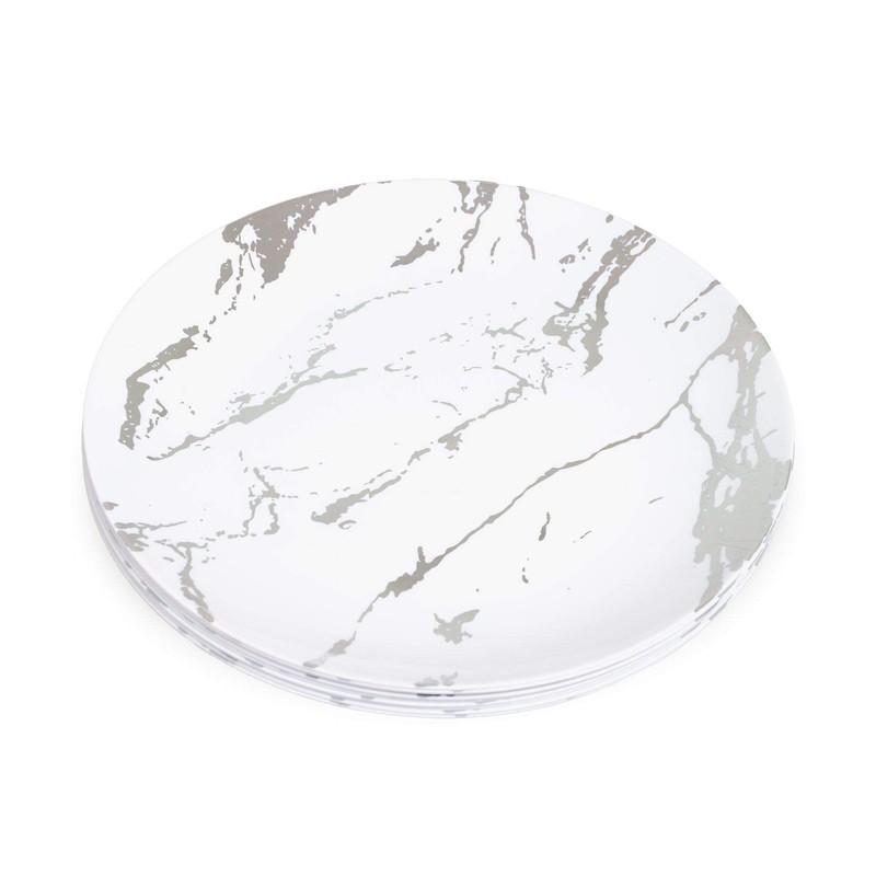 - ELEGANT MARBLE DESIGN: White and silver plastic plates will add a posh to your party. The unique marble design makes your party unique and eye-catching.