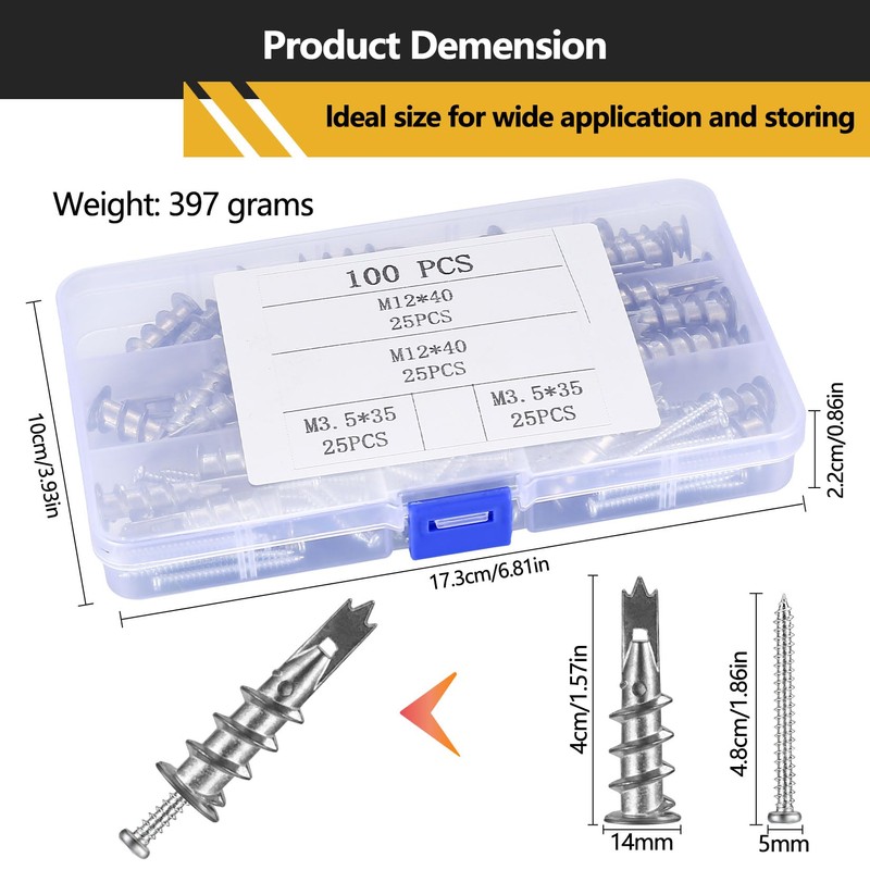 - The package includes: you will receive 50 pieces. Plaster dowels and 50 pieces. Self-tapping screws, the size is M3.5 x 35 mm and M12 x 40 mm, suitable for professional and home use, the quantity is enough to meet the requirements of different areas.