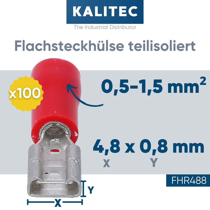 Pack of 100 Kalitec FHR488 Blade Receptacles Red 4.8 x 0.8 Cable Connector I 0.5-1.5 mm² Connector I Partially Insulated I Brass I PVC Collar I for Car and Industry