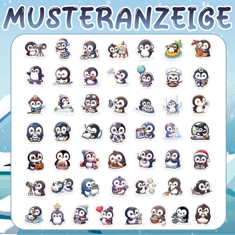- Sticker set – 50 different types of penguin stickers, 2 for each style. Pack of 100 waterproof stickers, 100% identical to the picture, the quality of the adhesive is good and lasts for a long time. They are suitable for the surface of various items. Stick these cute penguin stickers on stationery, laptops and water bottles to show your unique personality
