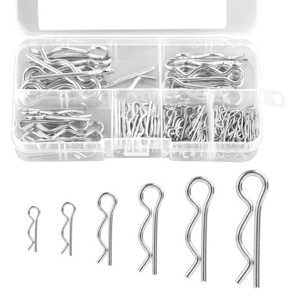 - Robust R spring cotter pins spring connector assortment for versatile applications. This set contains 100 R spring cotter pins in 6 sizes, ideal for securely attaching bolts and shafts. The R-shaped structure provides reliable grip on vehicles, machinery and trailers - rust resistant and durable.