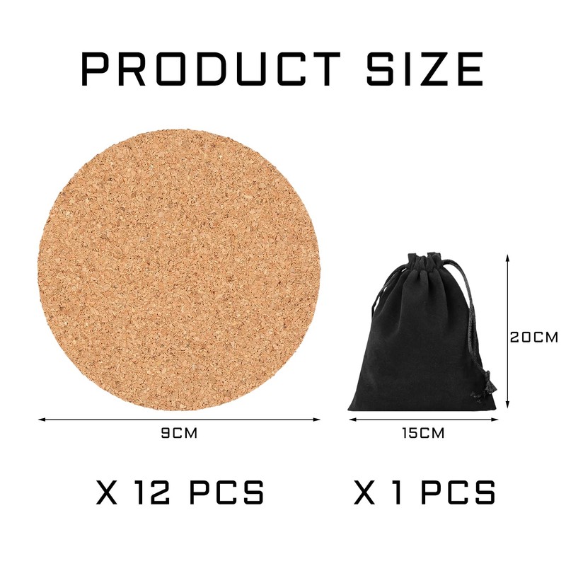 - The package includes:12 pieces round cork coasters, size 9 x 0.4 cm, 1 black storage bag, size 15 x 20 cm. A large number of coasters can meet your daily needs.