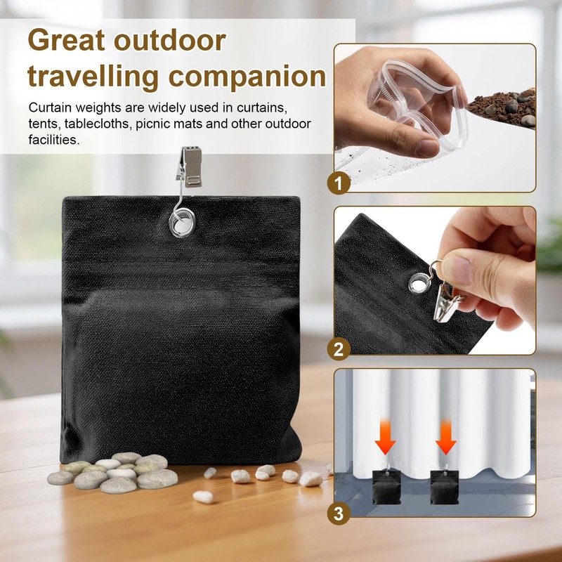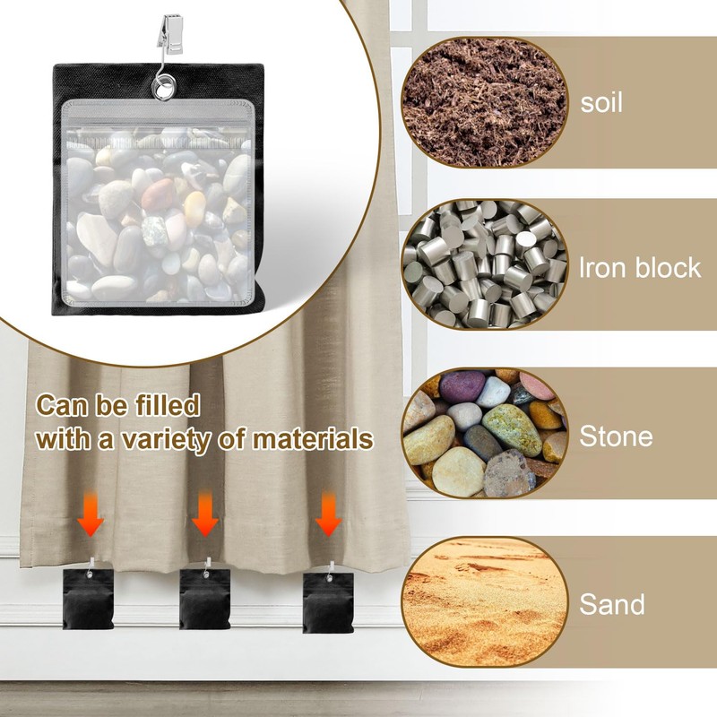 Easy to use: simply put fillers such as sand or stones into the PVC bag and then into the linen bag. Use the clips to attach the linen bag to the bottom of the curtains to complete the installation, quickly reinforce, save time and effort.