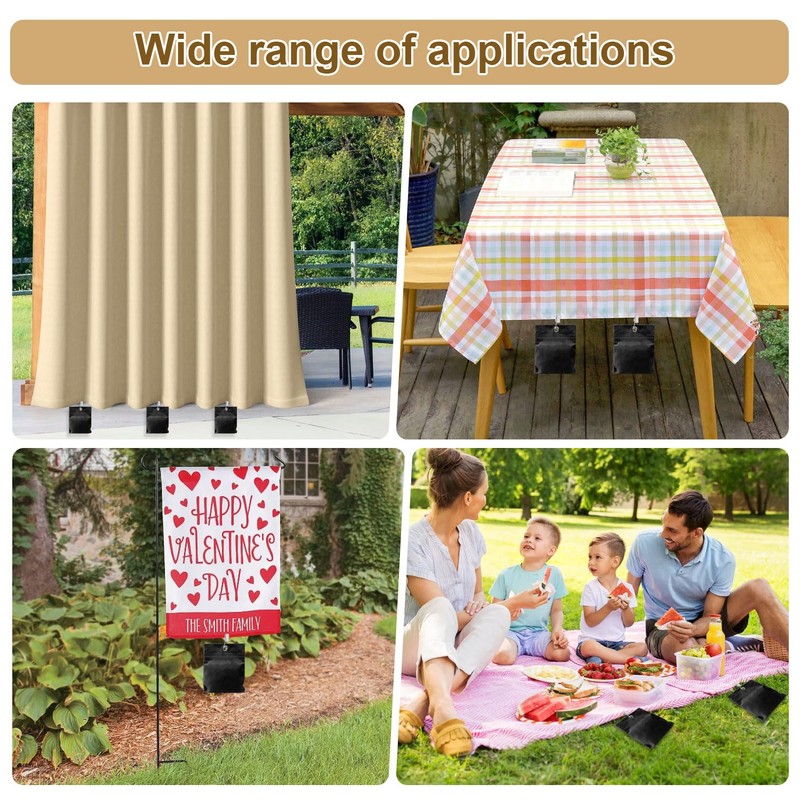 - Widely used: the tablecloth holder weight is widely used for awnings, tents, outdoor curtains, tablecloths, picnic mats and other outdoor curtains. Fill them with sand or stones as needed to adapt them to the different requirements of the scene