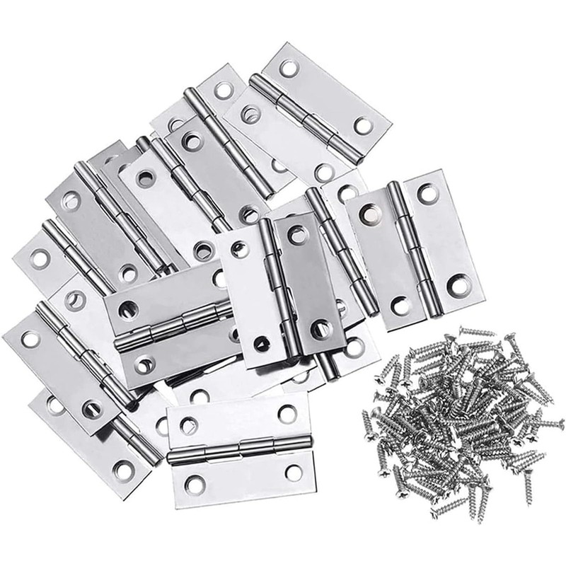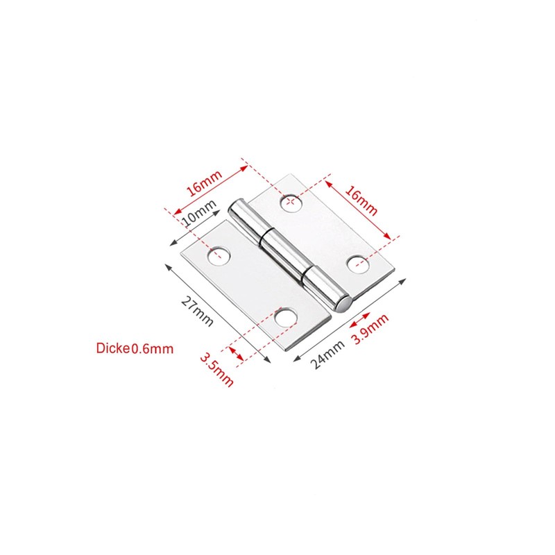 - Stainless steel hinges. Specifications: Package includes 12 x stainless steel hinge, 48 x screws. Hinge Size: 27×24mm Mounting Hole Size:3.5mm Screw Size: 15.5 × 6.3mm Appropriate size and quantity can meet your needs.