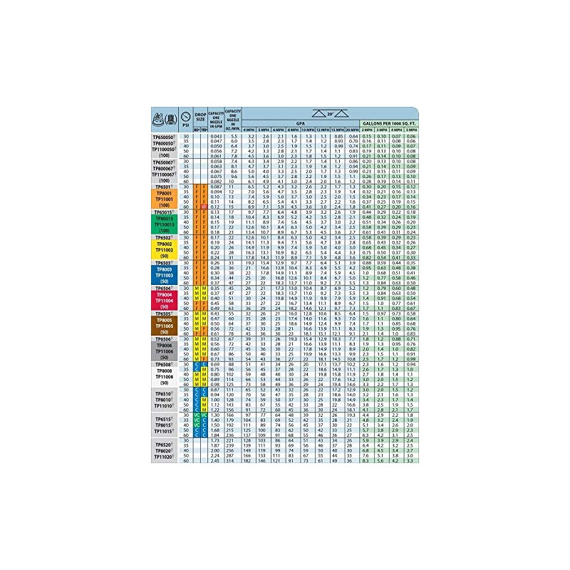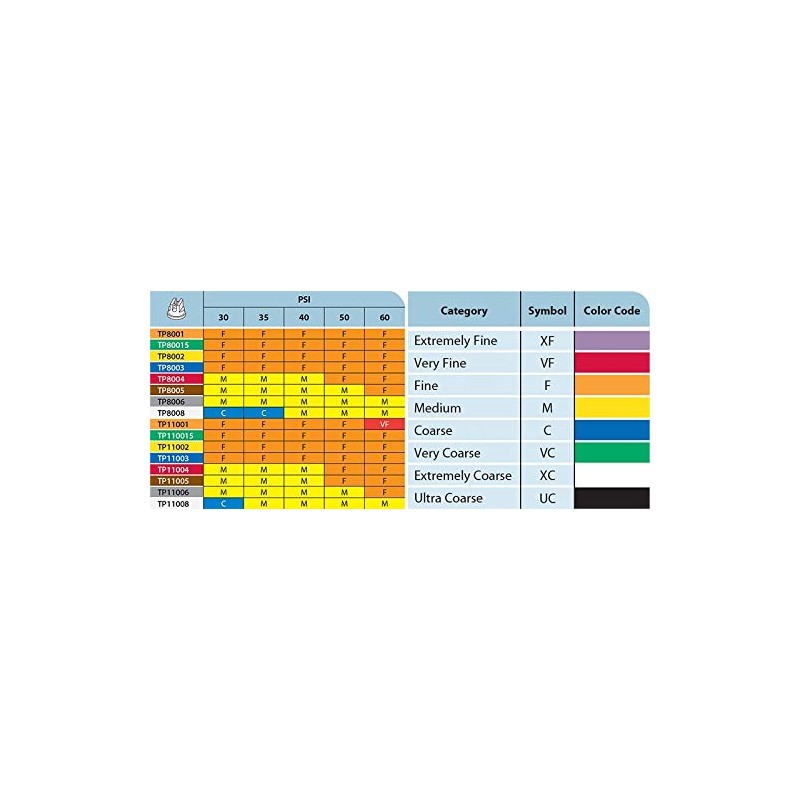 - See Chart in Pictures for PSI Ratings! Pack of 12 - TeeJet TP8002VP VisiFlo Flat Fan Spray Nozzle. Spray Angle: 80 degrees. Color: Yellow; Flat fan spray pattern. Poly core with VisiFlo color-coding.