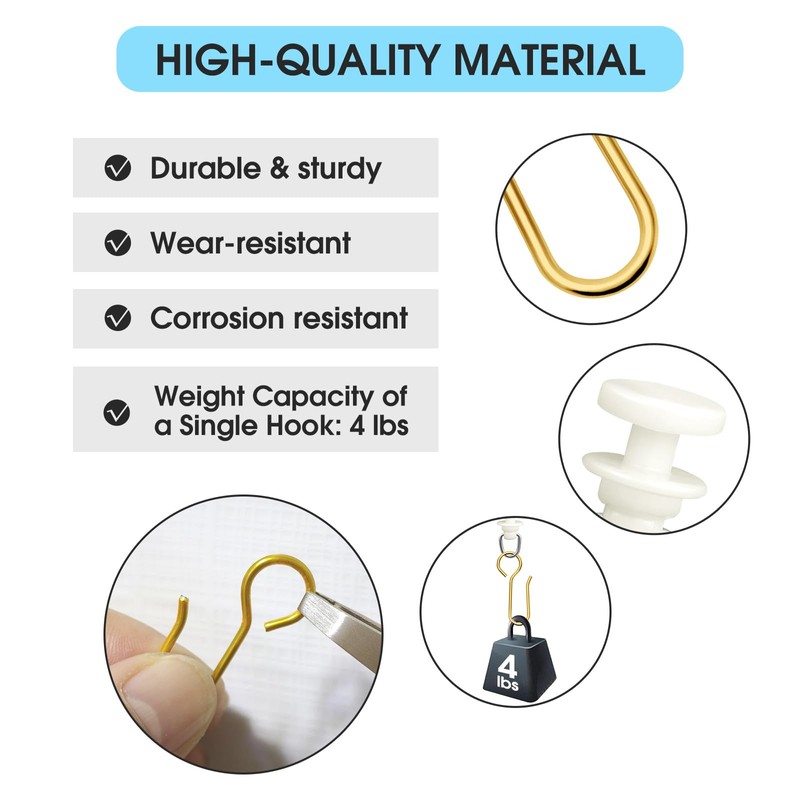 Features: 1. This set includes 60 hooks and 60 sliding hooks, which are enough to meet your daily needs. 2. Installation is simple and no other tools are required. 3. This set is only made of strong plastic and stainless steel, which has good corrosion resistance and wear resistance and can be reused. Specification colour: gold, white. Dimensions: hook: 1.38 inches/3.5 cm; glider: 0.9 in/2.3 cm. Weight: 206 g. Material: plastic, stainless steel. Package includes: 60 x curtain hooks. 60 x curtain gliders