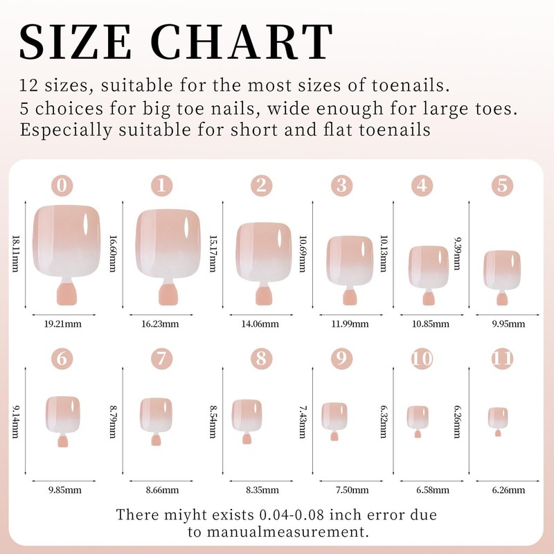 - Toenail tips set: the set contains 120 high-quality false toenails in gradient design. Nude gradient toenails for sticking on in 12 different sizes. There are 4 x 24 pieces simple ombre artificial toenails and only 1 x 24 pieces of toenails with acrylic diamond. Also included are a sponge nail file, a stainless steel cuticle pusher, a nail glue and two toe separators