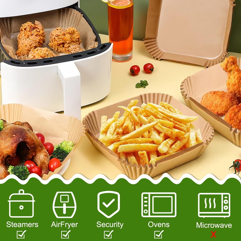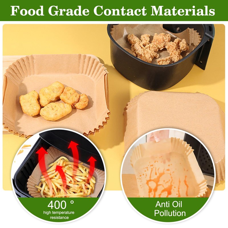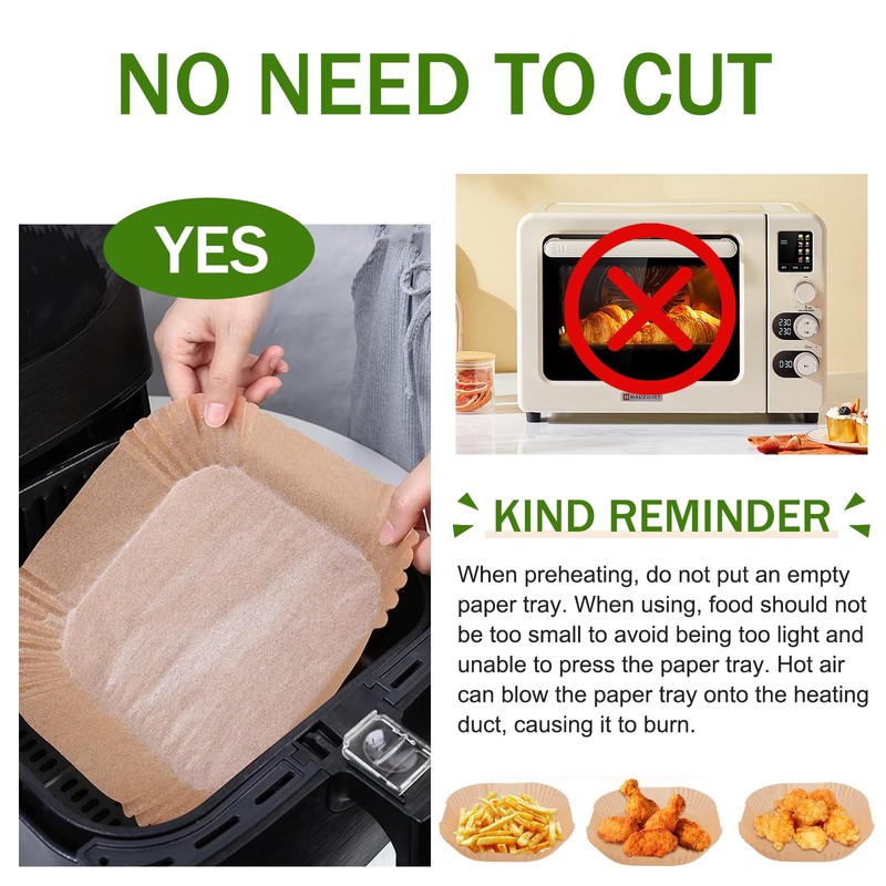 - Wide application: square hot air fryers baking paper can be used in hot air fryers, ovens, steamers, etc. and is suitable for daily baking pizza, roasted chicken, roasted sweet potatoes, baked cakes, chips, etc.