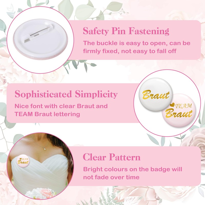 - Stable and firm: the back of this team bride buttons badge is an easy to open safety pin that can be firmly attached to clothing and does not fall off easily. With this badge, others can quickly identify the bride and bridesmaids at the party and become the centre of the party.