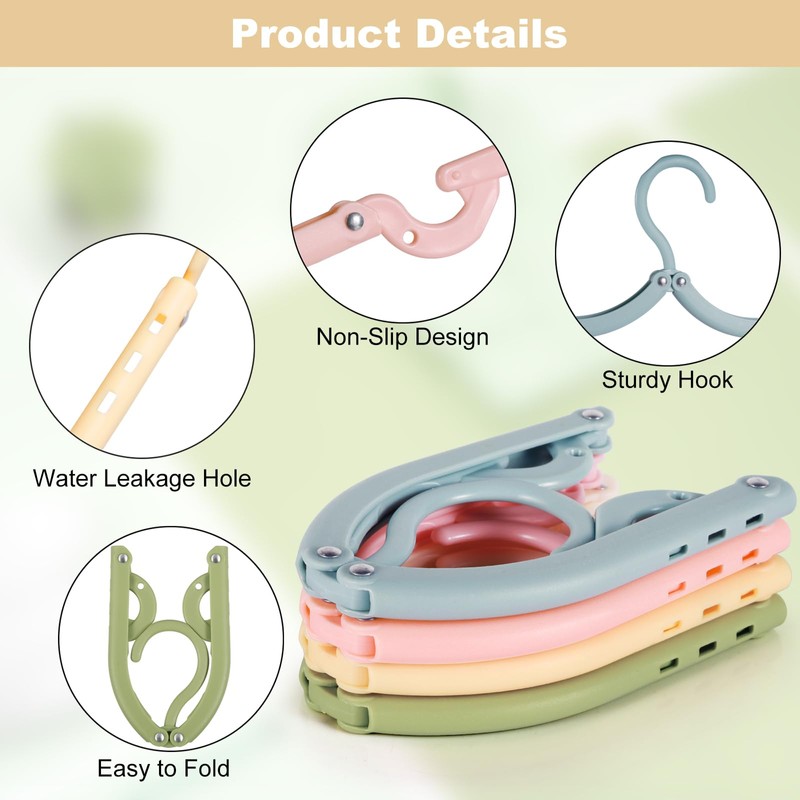 - Box contents: the package contains 16 foldable hangers. You will receive travel hangers in four colors: blue, beige, pink and green. Each travel hanger weighs 30 grams and its innovative 3-step design allows you to customize the drying method to suit your needs.