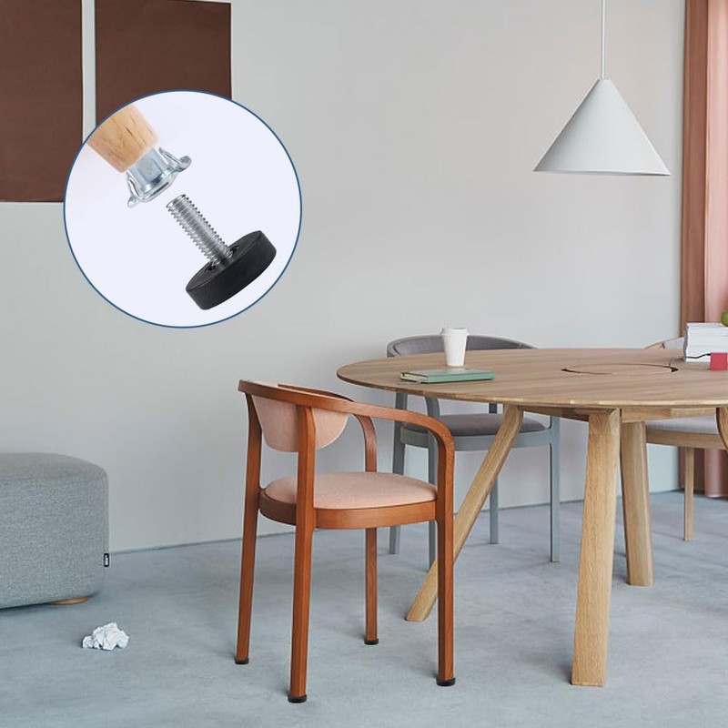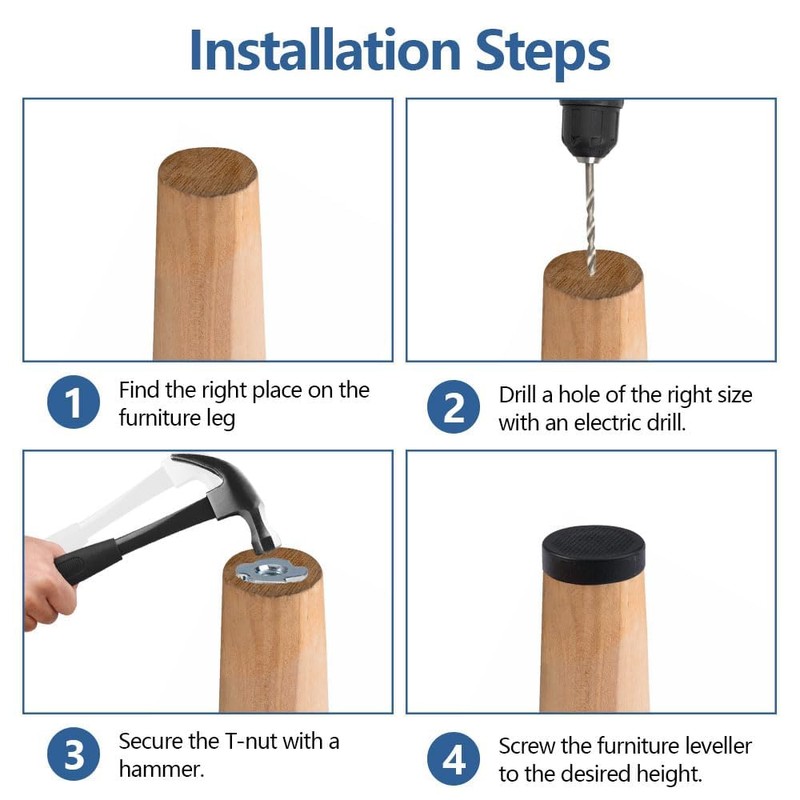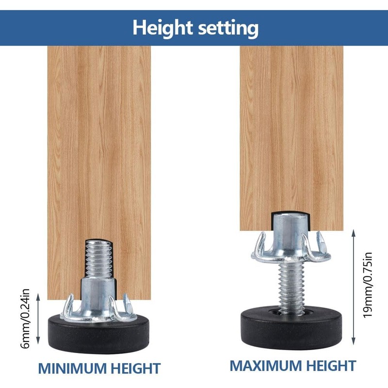 • Easy to Install: Table leg leveler is equipped with a drive nut, you just need to insert a hole with a diameter of about 8 mm and a depth of about 19 mm at the bottom of the foot, insert the jam nut into the hole and then screw the M6 adjustable foot into the jam nut. (Note: For furniture feet with a diameter greater than 1 inch. (If the size is too small, it may crack during assembly).