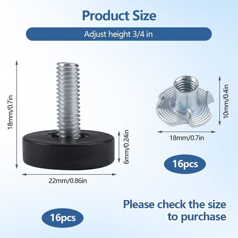 • Flexible Adjustmen: Adjustable feet screw diameter is 22mm, thickness is 6mm, square nut height is 10mm, width is 18mm, maximum adjustable height is 20mm to meet the leveling needs of different floors. Compact product design, suitable for a variety of furniture types, easy to realize the height fine-tuning.