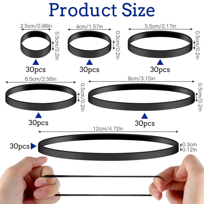 - 【6 sizes】: you will receive 180 pieces elastic band black, including 6 different sizes (2.5/4/5.5/6.5/8/12 cm), 30 pieces of each size, the larger the size, the stronger the strength, a variety of sizes can meet your various needs