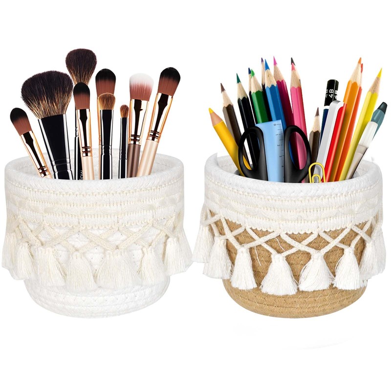 Pack of 2 Brush Holders, Storage Basket Braided Small, Boho Cosmetic Brush Holder, Boho Makeup Brush Container, Braided Dressing Table Organiser for Makeup Brushes, Pencil Box, Eyeliner