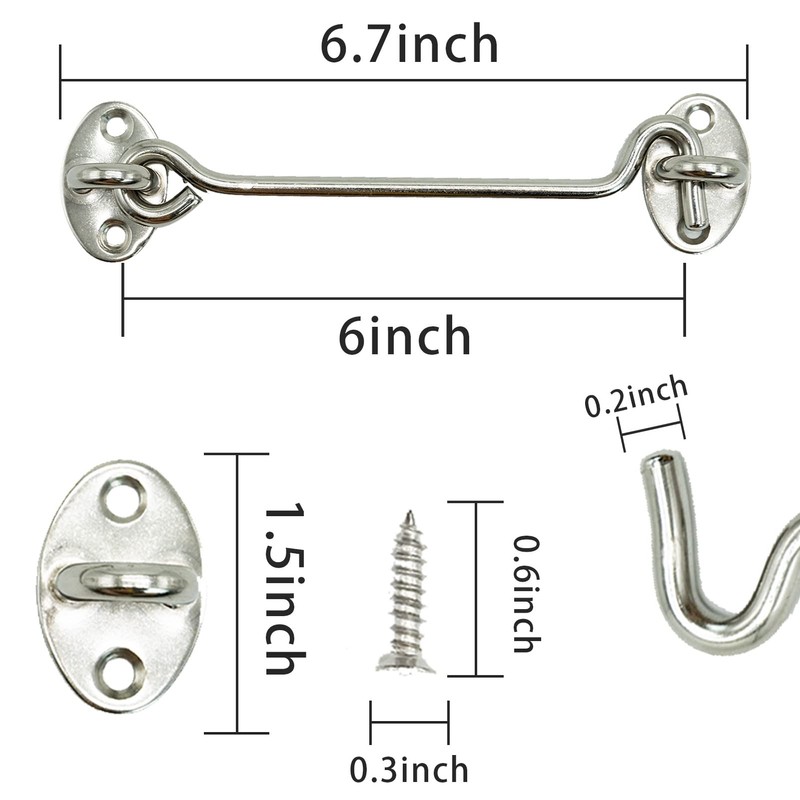 - Applicable specifications: We have 6 inches/150 mm cabin hooks, including 2 cabin hooks, 4 eyelet fasteners and 8 screws. This size is suitable for many situations. The hook lever can be rotated 180 degrees vertically and horizontally.