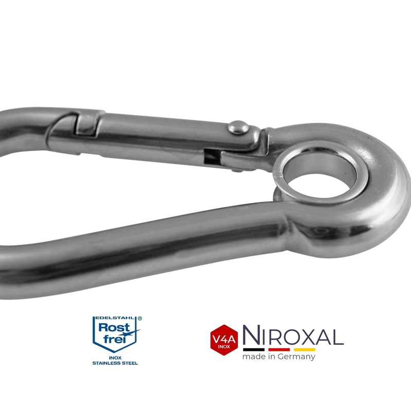 - Features: whether carabiner small or large carabiner, each individual has a thimble (also called eye) and is made of polished V4A stainless steel. This V4A stainless steel is manufactured in industrial quality (1,800 kg snap hook fire brigade carabiner 316 at 10 mm material thickness). Even cleaning is not a significant effort by simply rinsing. Corrosion infestation is not possible thanks to the rust-proof material, even in maritime environments.