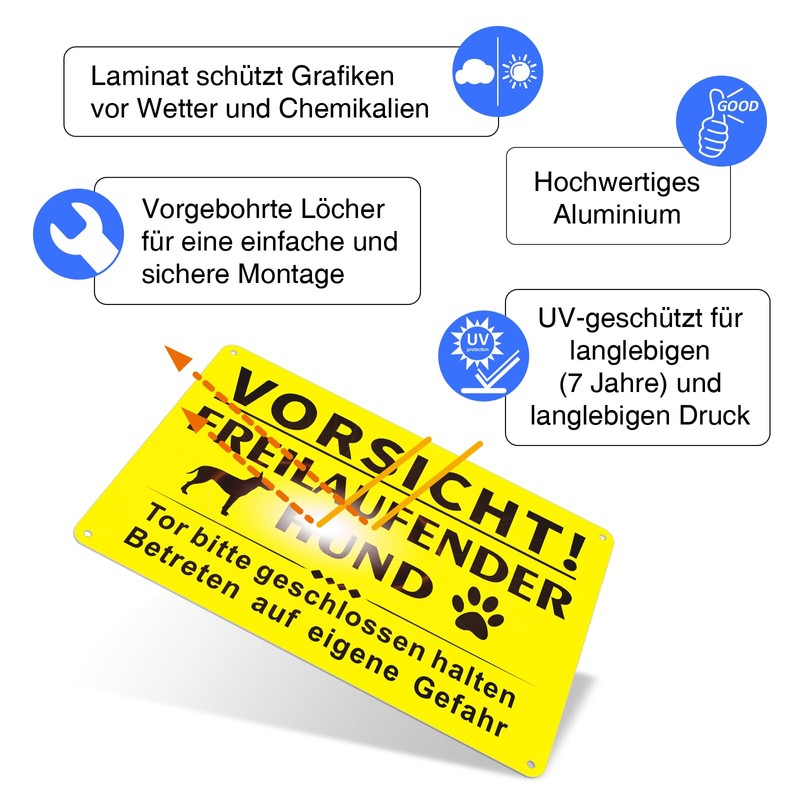 Pack of 2 Caution Dog Sign, 25 x 18 cm Free-Ranging Dog Sign, Metal Aluminium, Reflective Aluminium Warning of Dog Signs, Weatherproof - For Indoor and Outdoor Use, Yellow