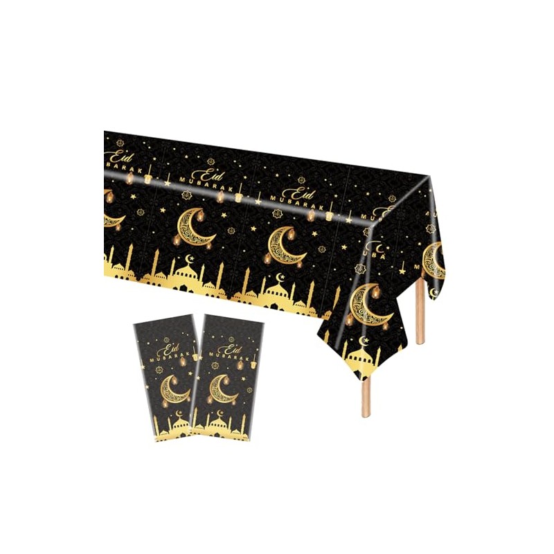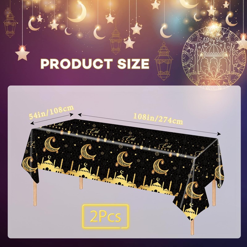 Pack of 2 Eid Mubarak Tablecloth, Plastic Rectangular Eid Ramadan Tablecloths for Eid Party Accessories, Waterproof Tablecloth for Indoor and Outdoor Dining Table (Black Gold)