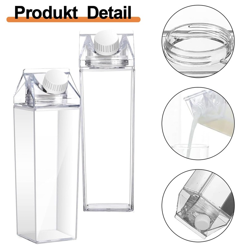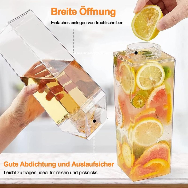 Pack of 2 Milk Carton Water Bottle, 1000 ml Clear Water Bottle, Square Milk Bottle, Transparent Milk Carton, Reusable Juice Container Bottle, High Capacity Clear Water Bottle, for Camping