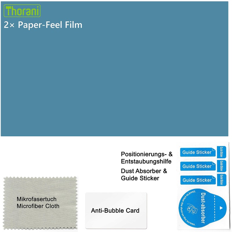 • Box contents: 2 x screen protectors with paper feel, 2 x application stickers for optimal and easy installation, 2 x dust removers and 1 x dust cloth for cleaning the display before installation
