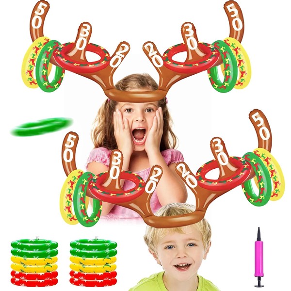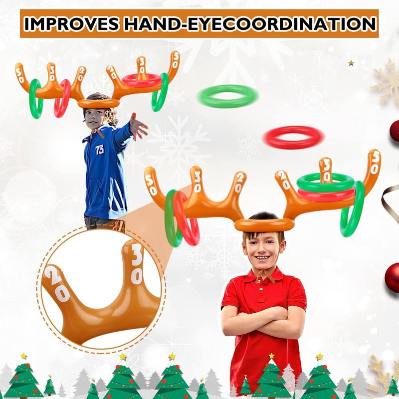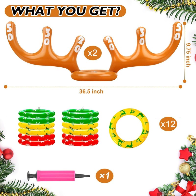 - Christmas inflatable ring toss game: you will receive 2 inflatable reindeer antlers, 12 throwing rings and 1 air pump. The Christmas toss game children is designed in the shape of a reindeer antler and each reindeer antler hat has two bands to prevent the reindeer antler hat from falling off. The Christmas ring toss game can liven up the atmosphere of a party, so everyone can join in, making it the perfect choice for Christmas or large family celebrations.
