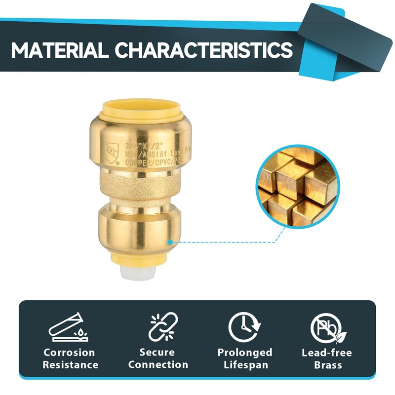 - Package Include: 2 pack 3/4 Inch x 1/2 Inch push-fit coupling and 2 disconnect clips. Fits copper, CPVC, PE-RT, and PEX pipes