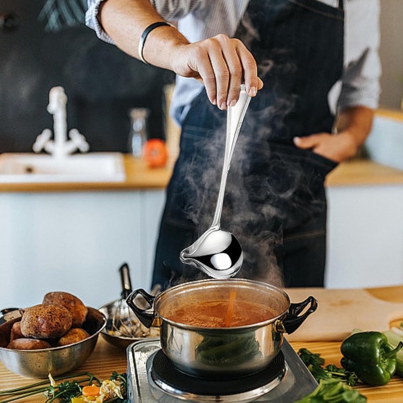 This set includes two soup ladles made of high quality stainless steel, perfect for use in the kitchen. The sturdy sauce spoons are dishwasher safe and therefore easy to clean. Measuring 10.5 inches in length and a built-in pouring spout, they are ideal for serving soups, gravies, dressings and other liquid foods. The small sauce ladle with pouring spout allows for precise and drip-free serving, while the ergonomic handle ensures comfortable handling. These spoons are durable, rustproof and fit perfectly into any kitchen equipment.