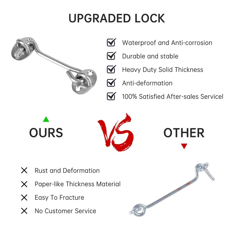 - Wide application: the gate lock can be used in any place and in any situation without worrying about rust and damage, even in rain or snow. Hooks are often used in wooden fences, cabin doors, rotating windows, garages, rails