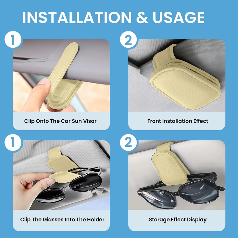 - Universal fit for any car, the glasses holder can be easily attached to any sun visor and is suitable for all standard vehicle models. No complicated installation.