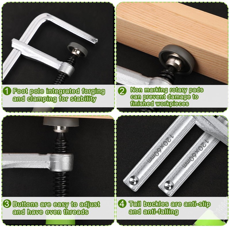 - Details: the bar of the clamp is forged into 1 piece with strong stability; a traceless rotating cushion to avoid damage to the workpiece. Ergonomic, adjustable, even threads; the screw surface is black without bending or twisting; the TPR seal of the press foot adopts TPR (thermoplastic rubber) soft fabric plastic seal, which prevents damage to the wooden surface. The tail buckle is not easy to fall off or slip. .