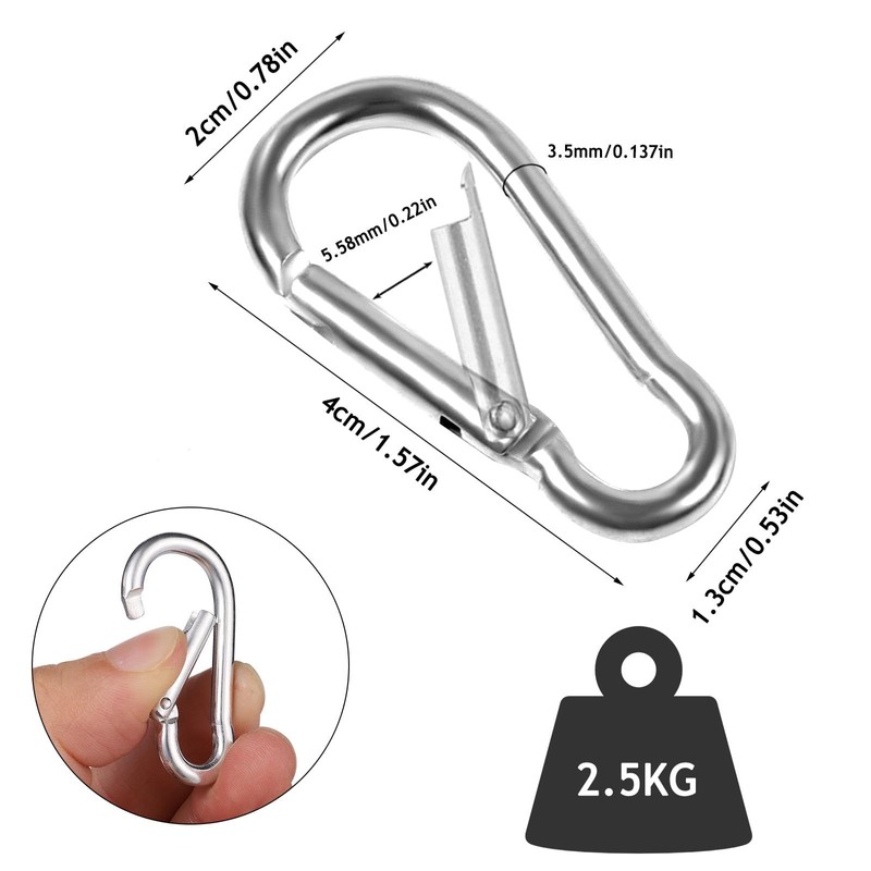 - Box contents: you will receive 20 carabiner hooks, enough for daily use. Length: approx. 40 mm. Thickness: approx. 4 mm, load capacity up to 2.5 kg.